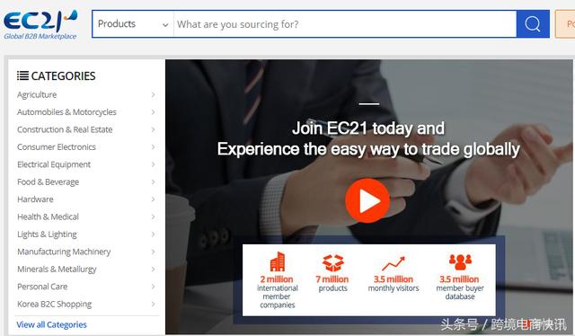 EC 21于1997年在韩国成立,是世界十大在线B2B平台之一。和阿里巴巴国际站一样,这是一个全球市场,拥有100万买家,每月询价超过600000次。它最初是韩国国际贸易协会(KITA)的在线交易委员会,EC 21于2000年独立。